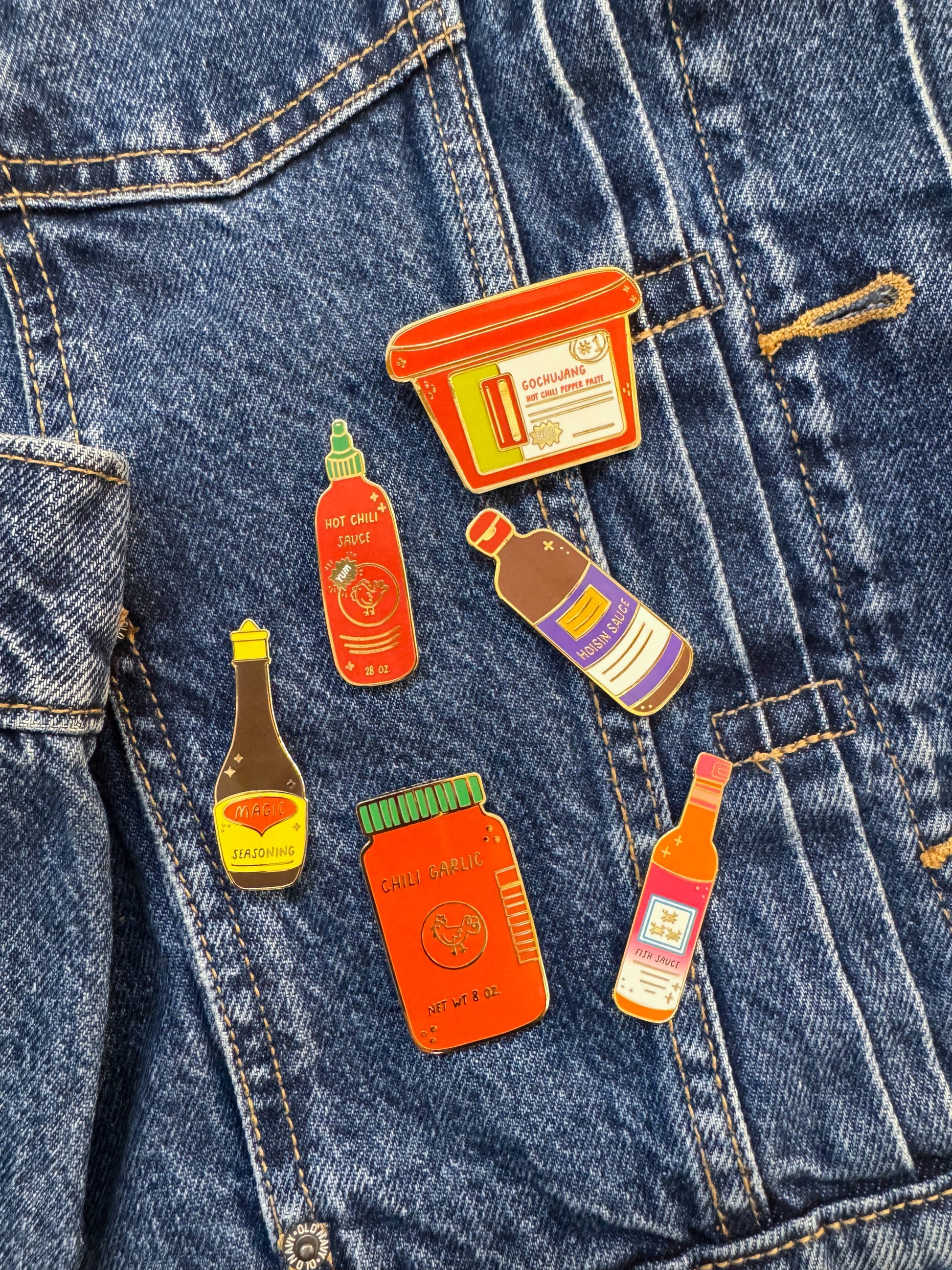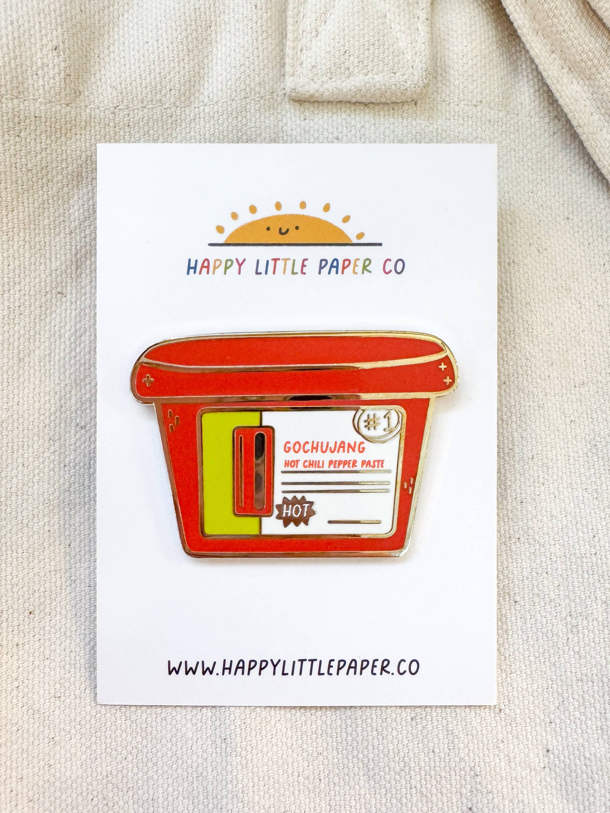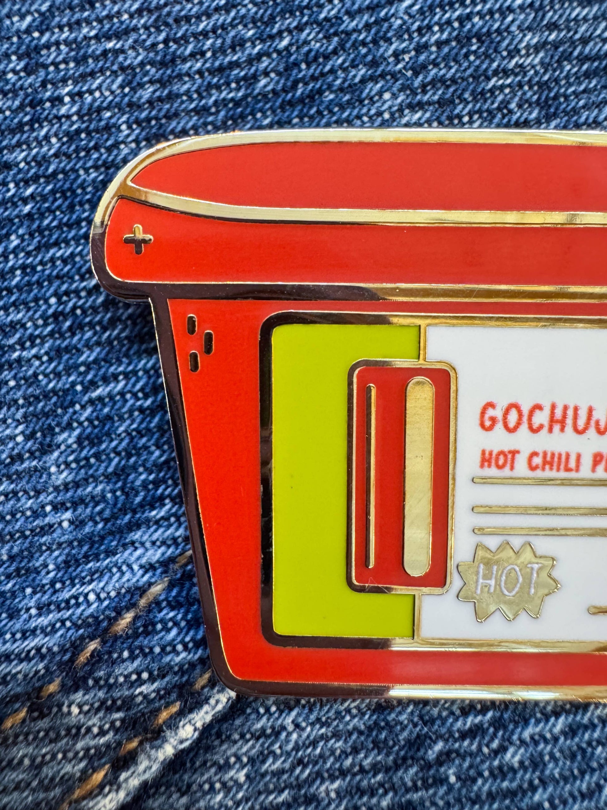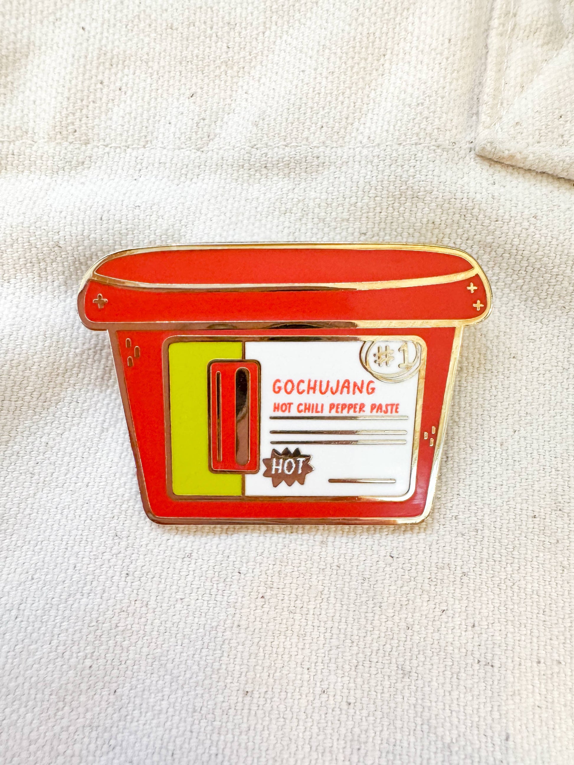 Show off your love for spicy flavors with the Gochujang Enamel Pin. This large, vibrant pin features a fun gochujang hot pepper paste container design and comes with double backing for secure wear. It's the perfect playful accessory to add a pop of heat to any outfit or bag.
