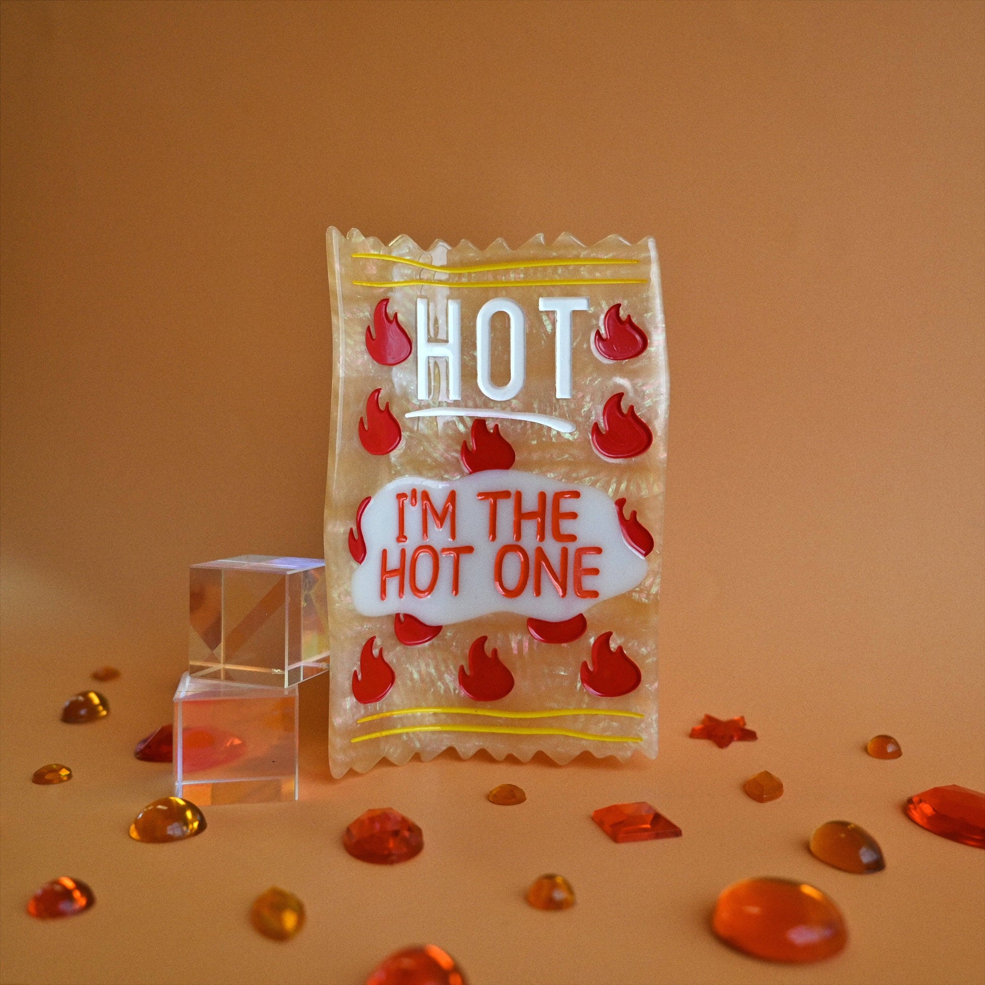 Based in a small home studio, every Tiny Made product is a testament to the brand's dedication to quality and creativity. This clip adds a fun and functional touch to your hair routine. Express yourself boldly and confidently with Tiny Made's Hot Sauce Packet Clip.