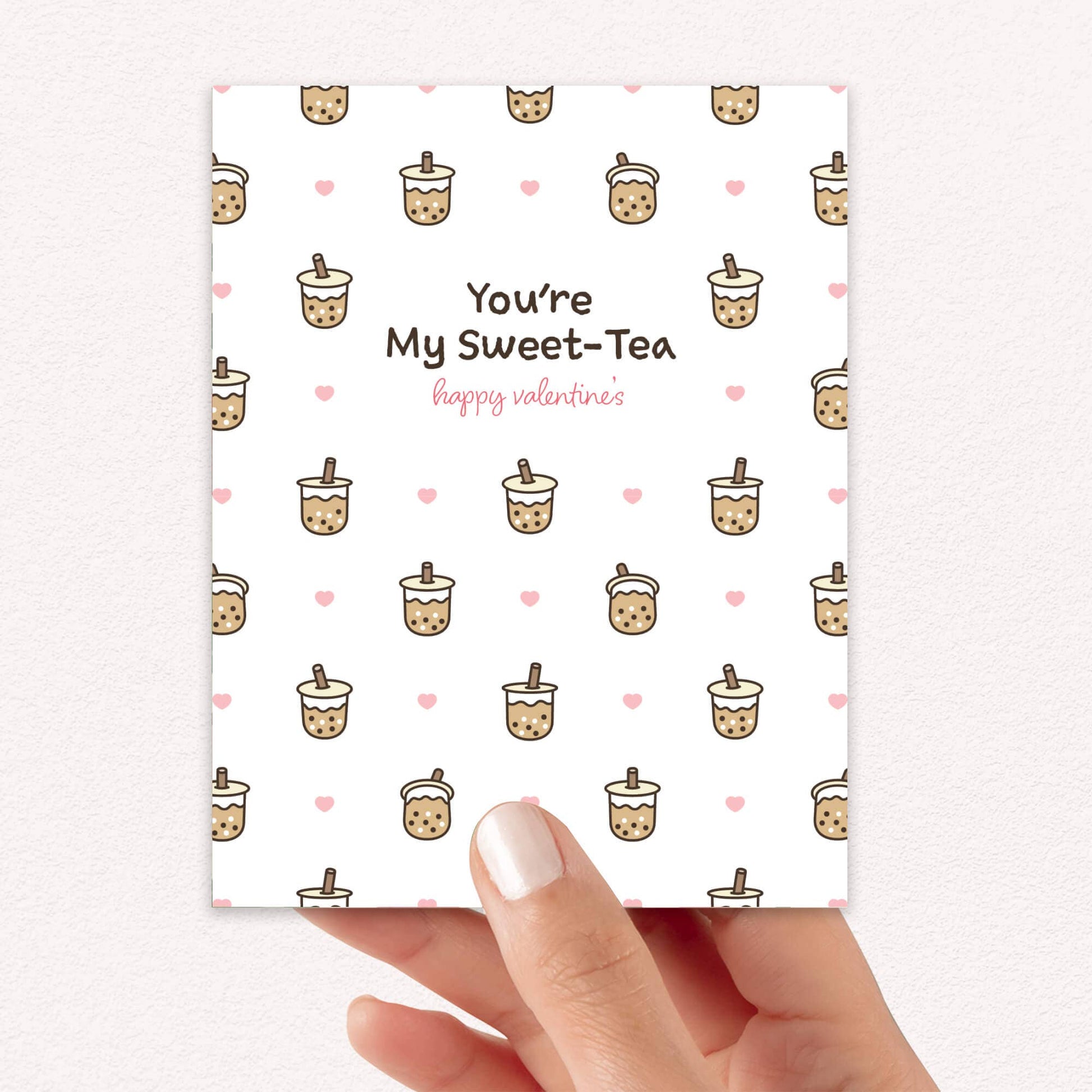 A repeating pattern of boba milk teas and hearts with a cute message: You’re My Sweet-Tea with a light pink script. Graphic, playful, and ready for tea-date invites. A favorite in cute bubble tea Valentine cards to celebrate the occasion. Pairs well with milk tea, mochi, or a dessert gift card. ✍️