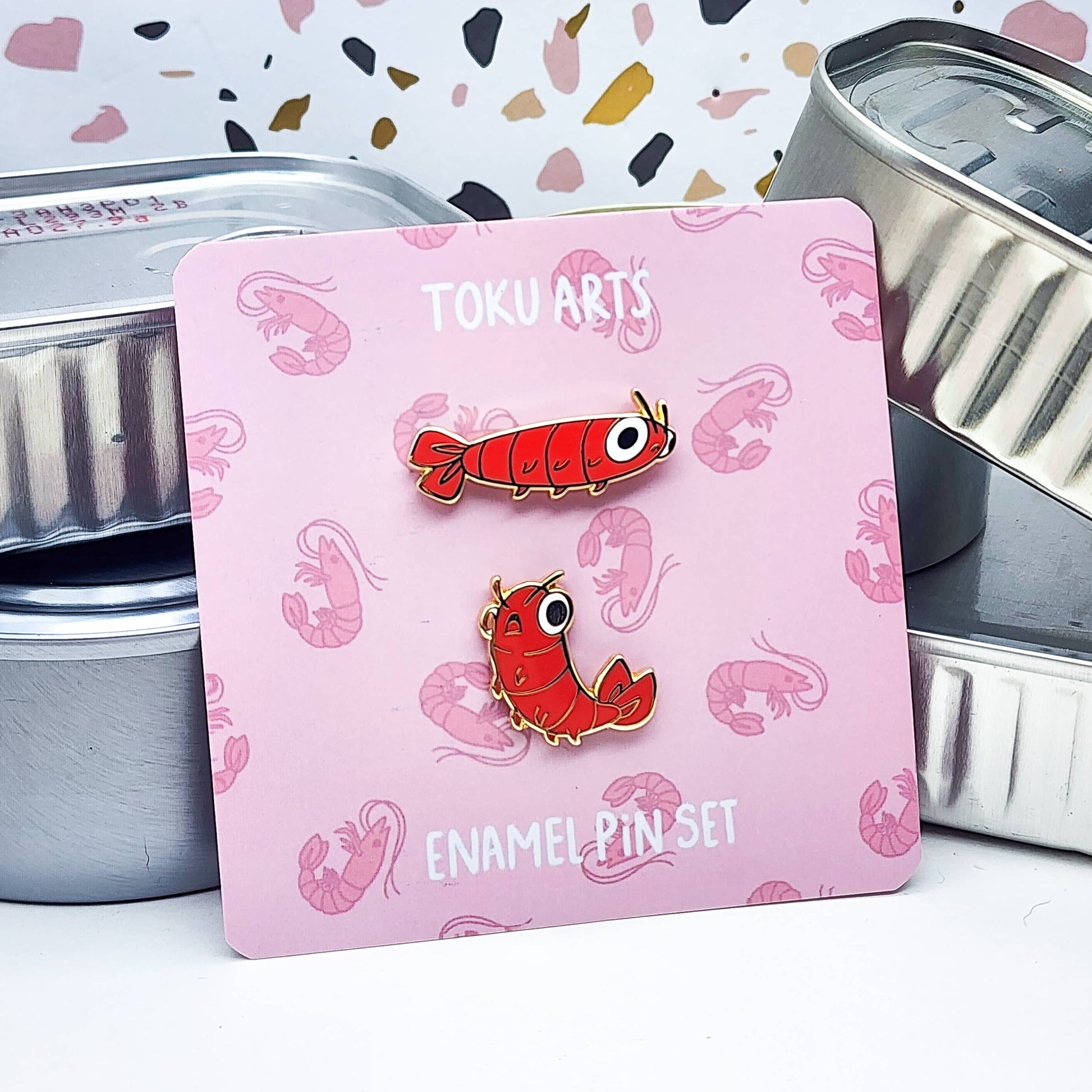 Nyyyyyyoooooom. Perfect for filling the spaces on your ocean themed pin board or adding to any shrimp inspired outfit. Set includes 2 shrimp mini enamel pins.